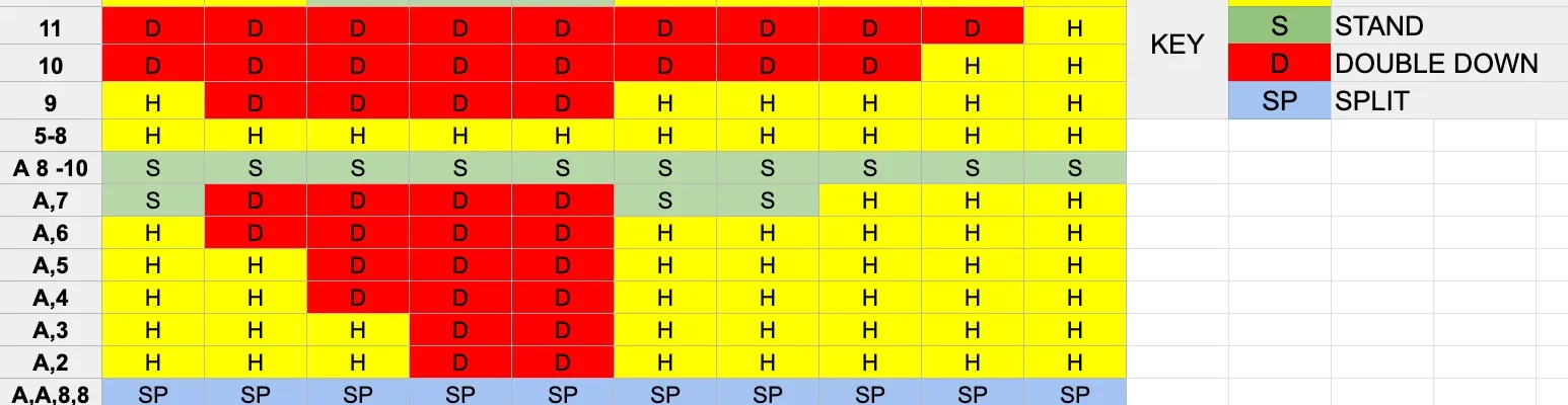 In the next picture we have a blackjack basic strategy chart with each step to take in every possible situation in a blackjack session.